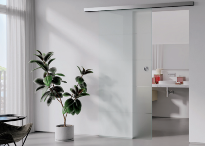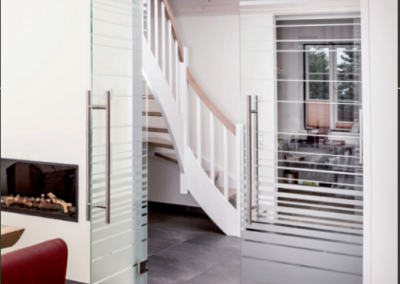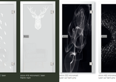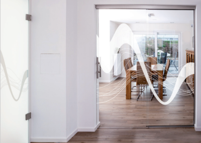 Die klassische Art der Glasveredelung: Durch das Sandstrahlen einer Glastür mit einem feinen Korn entsteht eine mattierte Fläche ohne wesentlichen Lichtverlust. Wenn Sie keine Durchsicht wünschen, können wir auch das Motiv zusätzlich auf satiniertes Glas aufbringen.